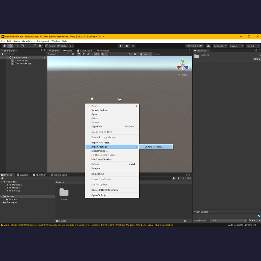 Then select unity package: VRCSDK3-AVATAR-2021.11.08.14.28_Public4) Right click Assets tab select import package >> custom package.