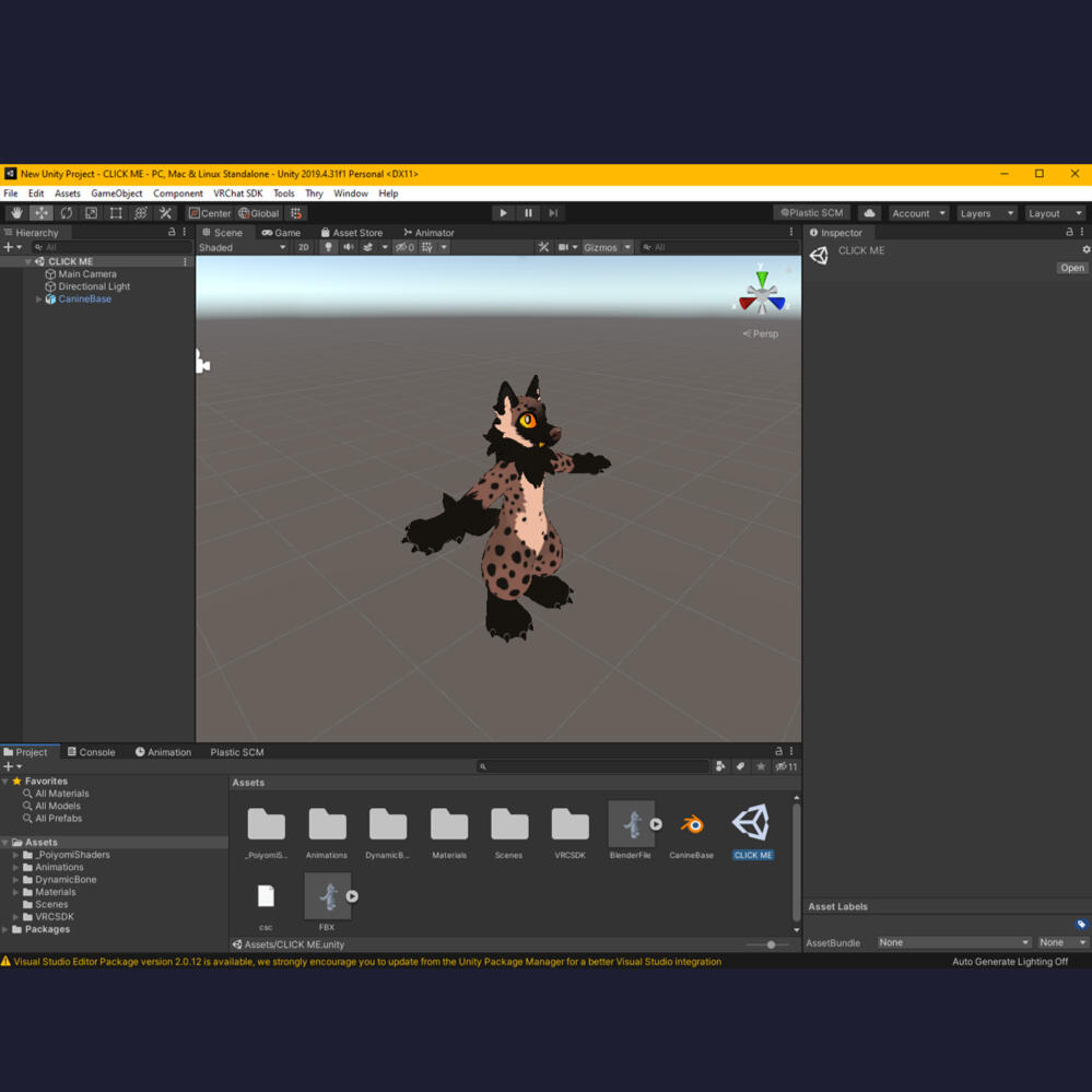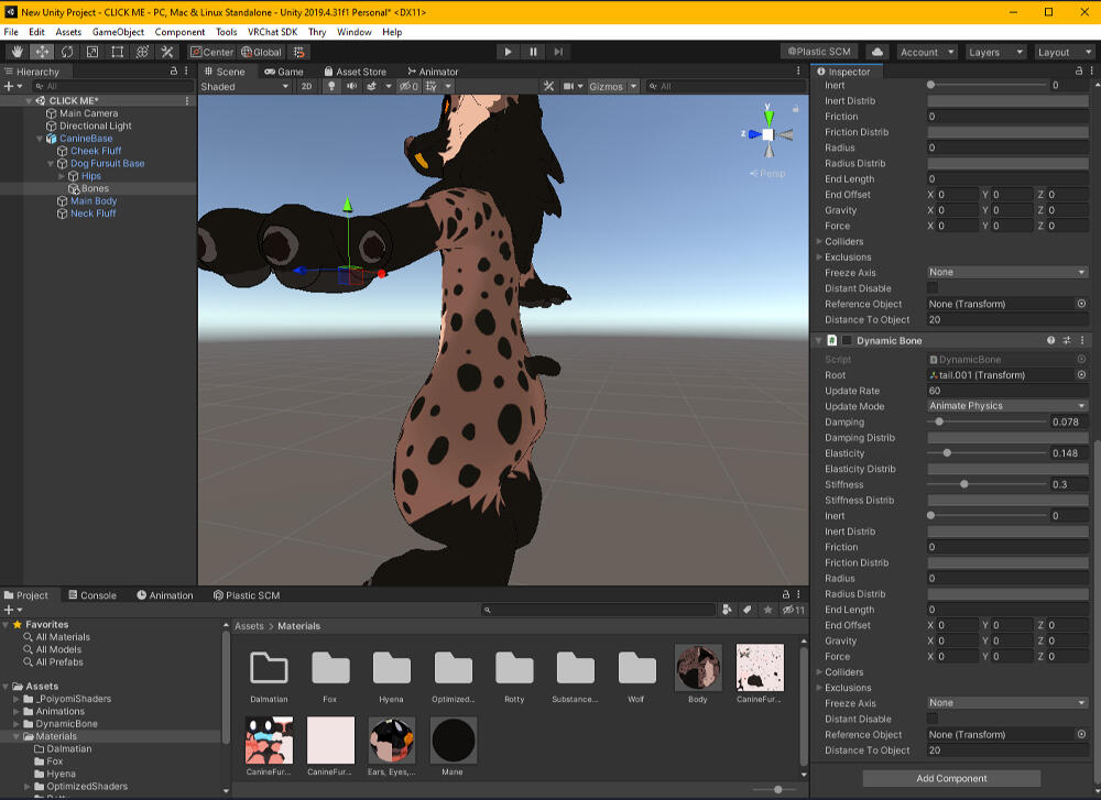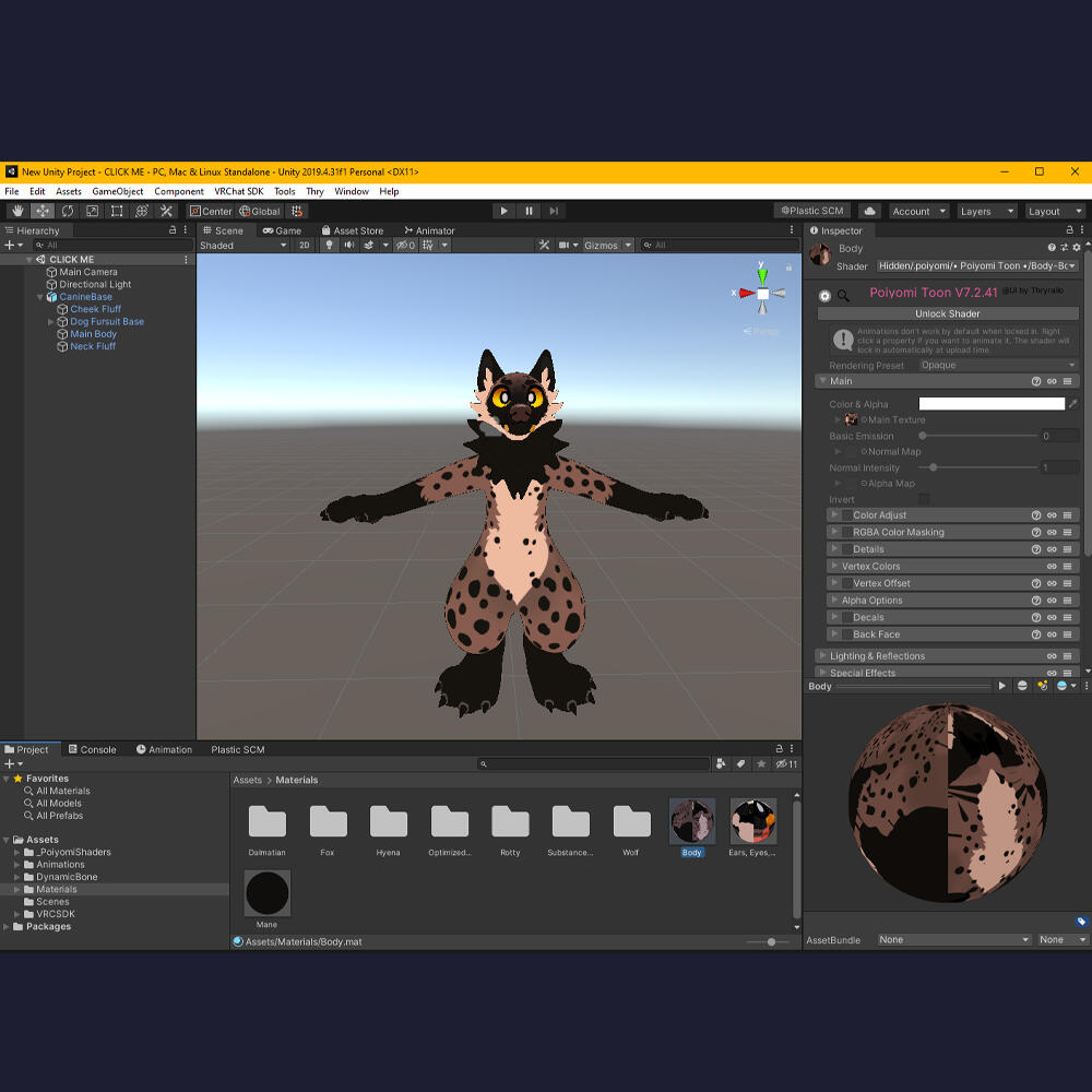 Set upIf you have custom textures it's now time to import them into Unity. To do this drag and drop the files into the materials folder in the Assets tab.For the BGB Canine base you should have the three textures files in PNG format. Or two if you are not using neck Fluff!To add your textures, click on the Material sphere in the materials folder in the Assets tab. It should look like the image below!Note If the shader says "unlock shader" like in the image below just click unlock shader to begin adding your custom textures! We do not recommend changing shaders as our Base's "follow me eyes" will not work correctly!
