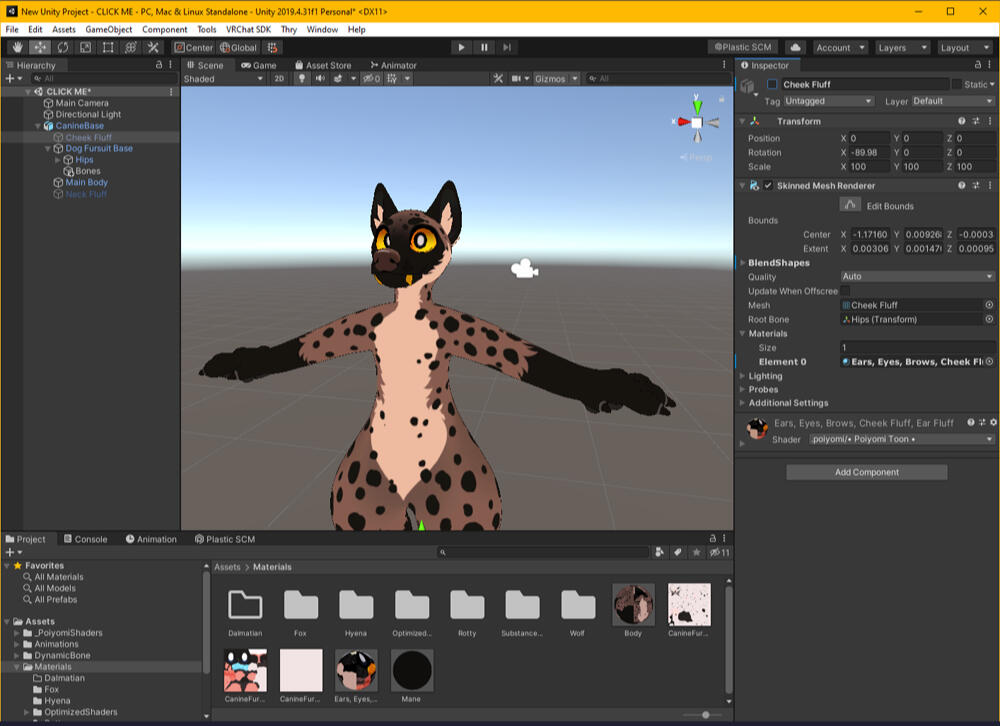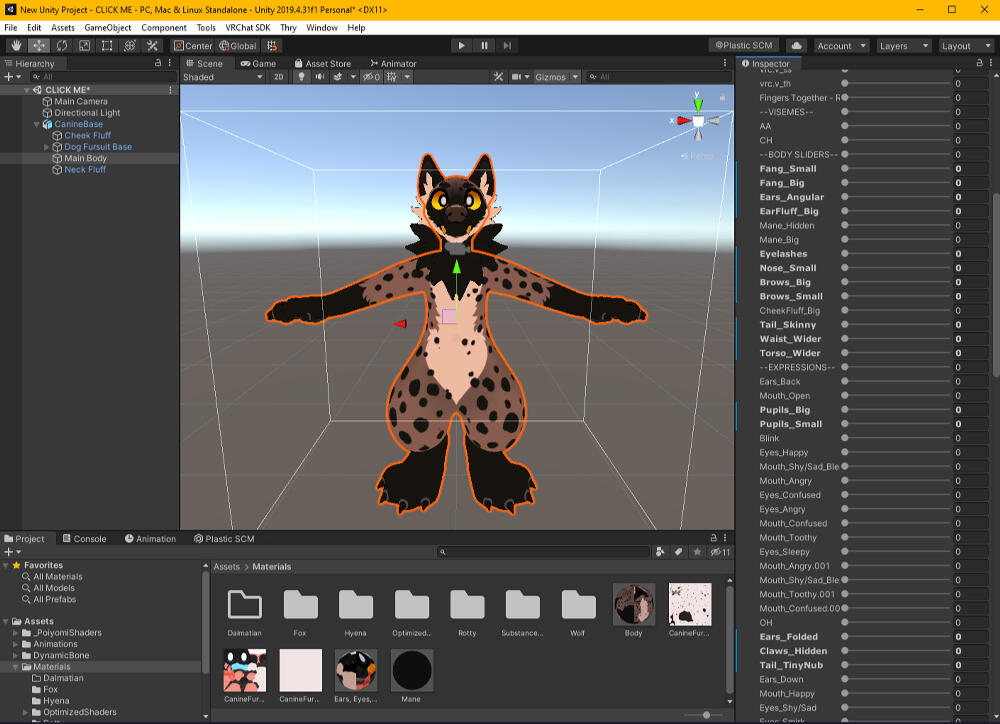 Blendshapes are what let you customize the shape of your Avatar. For the BGB base, this means Ears, teeth, body, brows, nose, and tails, and fluff levels!To access your Blend shapes click on the object labeled main body on the left-hand side of the screen under the tab "Canine Base"On the right hand side of the screen in your "inspector" open the drop-down menu called Skinned mesh renderer and then open the blendshapes menu found within.Now you will see the blendshape sliders which you can adjust by dragging the circles next to each Blendshape name that is bolded in the image below. The names will not be bolded in your Unity file so please refer back to this image when using blendshapes!Note: You can only edit certain Blendshapes that are BOLDED in the image below, if you edit anything else it will break the model!!!!Try not to mix ear or tail types as this will also cause issues with the models.If you want to edit cheek fluff or neck fluff blendshapes instead of clicking on the MAIN BODY object click CHEEK FLUFF or NECK FLUFF on the left-hand side of the screen and follow the same steps as above!